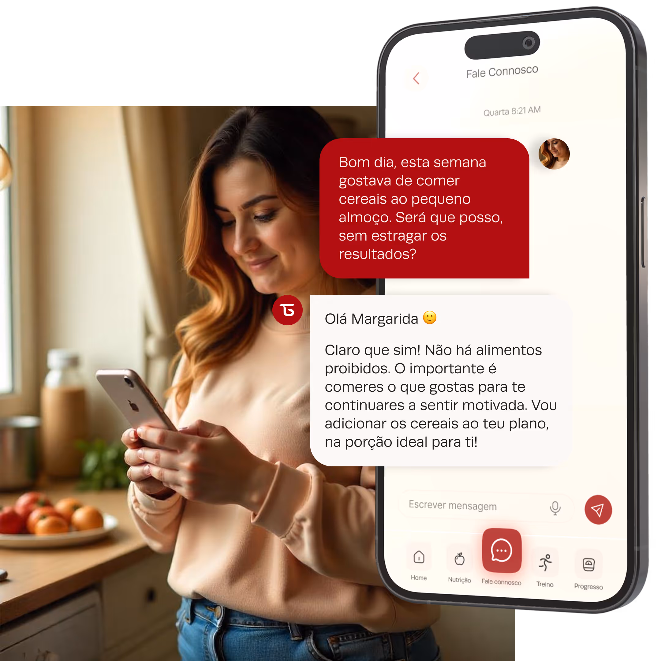 Treino, nutrição e suporte diário, tudo personalizado à tua rotina, aos teus gostos e ao teu corpo. Com uma equipa real que te acompanha todos os dias.